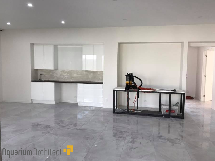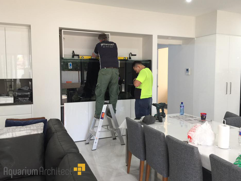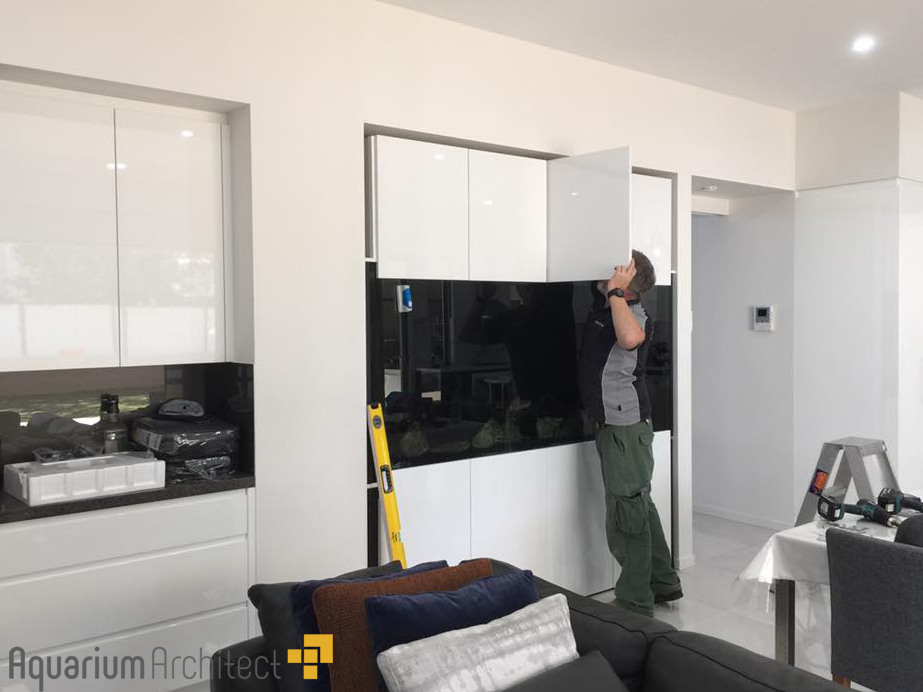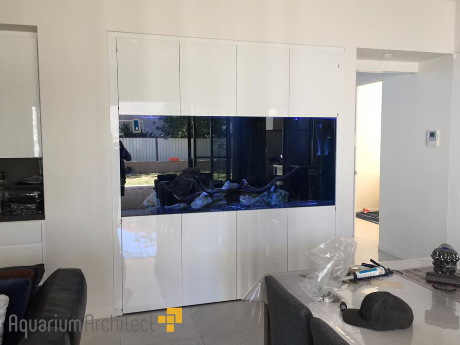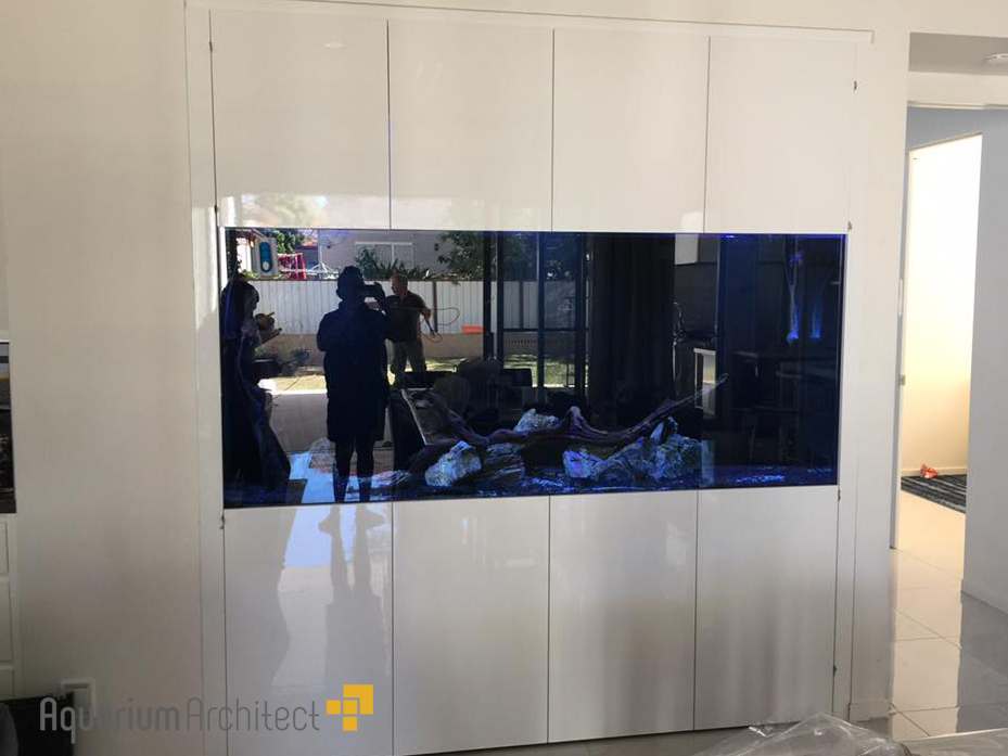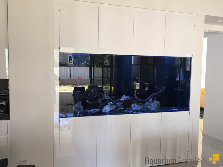 Our In-wall Cichlid Aquarium provides a unique focal point for this new, minimalist open-plan home This new Sydney contemporary home required a minimal in-wall aquarium which would integrate seamlessly with the design aesthetic. Our build includes custom cabinetry, Sump-filtration, LED lighting and other equipment necessary to successfully house Freshwater Cichlids. The impressive gloss finish and clean lines of our custom cabinetry provide a stunning framework for the tank inhabitants and tie in with the interior design. The aquarium provides a stunning focal point for the home and provides a relaxing feature to the adjoining kitchen and open-plan living room. Crystal clear water was achieved with our purposefully designed biological and mechanical filtration system, which contains several types of bio-media, which are specifically suied to these fish species.